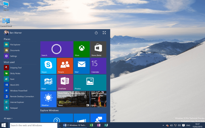 I’m not a tech expert per se but I do use my computer a fair bit and I know my way around. One of my big complaints about Windows 8.1 is that it doesn’t look right on a high resolution screen. I run Windows 8.1 on my Retina MacBook Pro (under Parallels) and although it certainly works fine, the layout and design isn’t quite right. Whereas OS X on the Mac gets the scaling right while accounting for all those extra pixels, Windows 8.1 isn’t consistent, and as a result, it has to rely on some zooming features in different parts of the interface to “attempt” proper scaling on a retina display. The first thing I noticed after installing the Windows 10 Technical Preview is that you can tell Microsoft has started addressing this problem. The taskbar and start menu now look right and in proportion. The start menu itself is back, and although it appears a little unwieldy out of the box, you can customise it to be exactly what you need (something which of course is not possible in Windows 8.1). And although I haven’t test it properly yet, I can see that its built in ability to switch between tablet and desktop mode is a lot smarter than the “2 UIs in 1” approach taken with Windows 8.1.